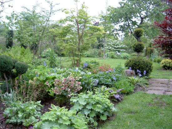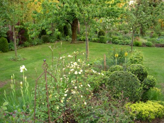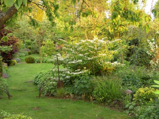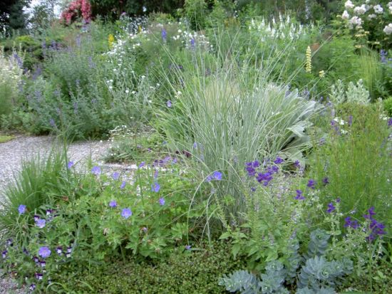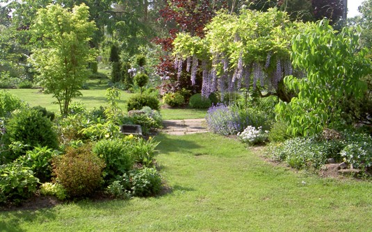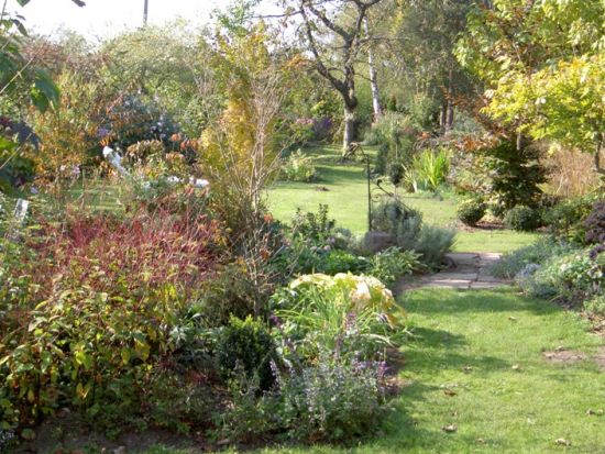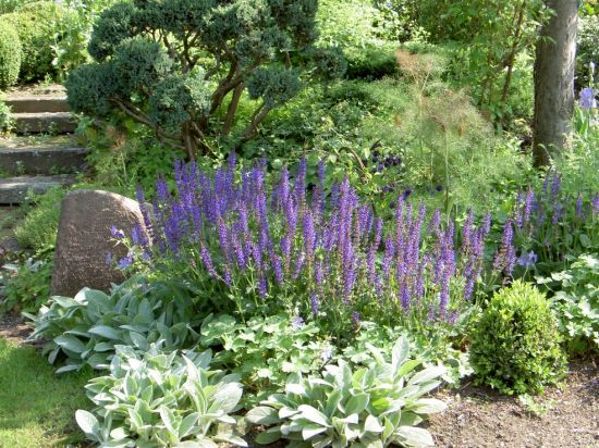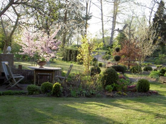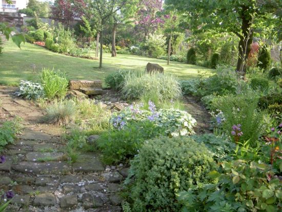 Nous avons progressivement réaménagé l’espace en plantant de nombreux arbres et arbustes à feuillage ou floraison intéressants, des buis, des ifs. Les vieux arbustes ont été taillés en nuages. Le talus accueille maintenant des plantes robustes dans une harmonie de bleu, violet, jaune et blanc : sauges, hémérocalles, agastaches, graminées. En automne de nombreux asters illuminent l’endroit.
