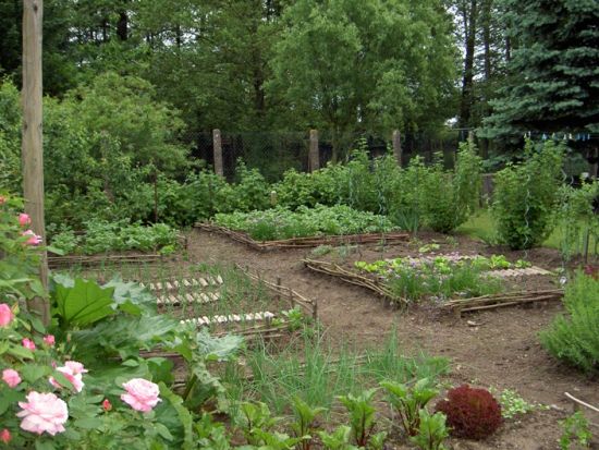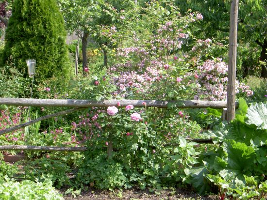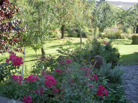 Plus loin, dans un coin plus ombragé les hortensias, hostas, fougères, acers nous invitent à une petite halte. La promenade nous enmène dans le verger où les fraises des bois se glissent parmi les asphodélines, iris, rosiers jaunes et rouges, helleniums, pavots en créant une ambiance chaude et gourmande.