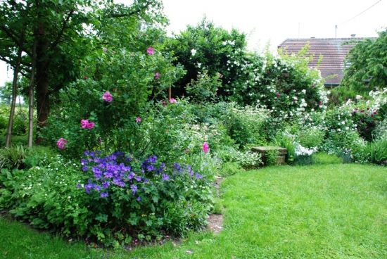 Le rosier rugosa 'Belle Poitevine' bordé du géranium magnificum