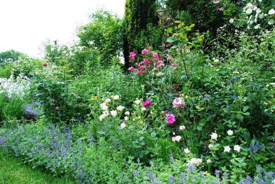 Les népétas, plantes aromatiques très appréciées des chats, bordent les rosiers