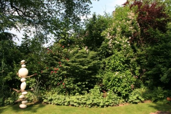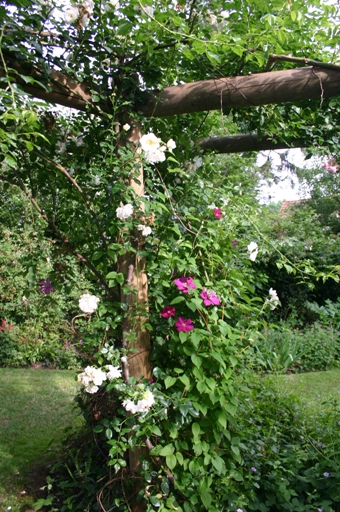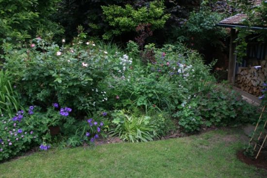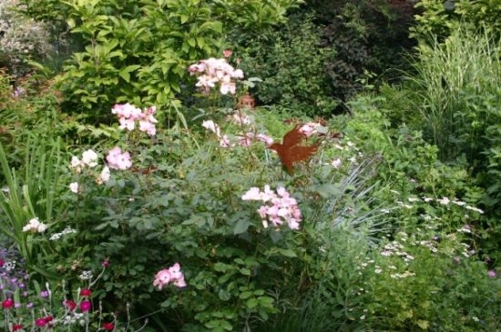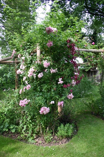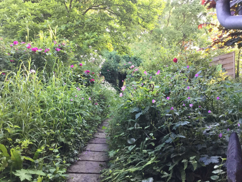 La visite d’Un Jardin d’herbes folles, que Martine HETZEL a créé il y a plus d’une vingtaine d’années, commence par la traversée du « jardin de grand-mère », en hommage à la sienne qui cultivait un potager ouvrier à Cronenberg, parsemé de nigelles de Damas et de coquelicots. Cet espace est dédié aux premières roses anciennes du jardin, très parfumées, telles Rose de Recht, Fantin Latour et Aimable Amie. Des plantes vivaces à foison, des fougères, des arbrisseaux leur tiennent compagnie : alchémilles et hellébores, pervenches et camomilles, lysimaques pourpres et herbes folles.